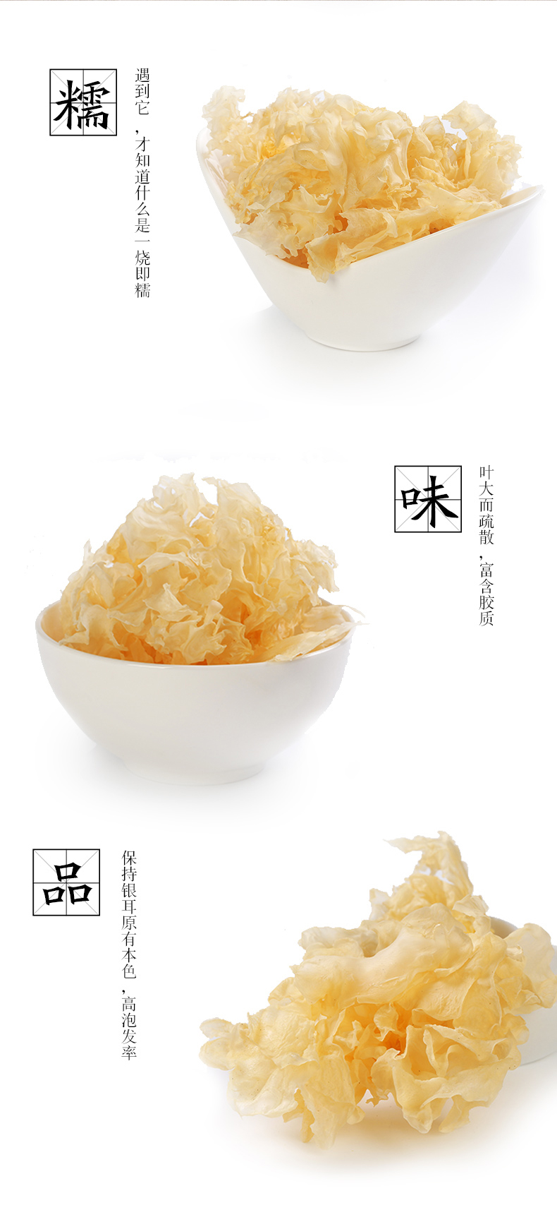 臻選香菇100g;臻選桂圓100g;臻選片狀銀耳(特級(jí))100g;臻選東北黑木耳(一級(jí))100g;臻選枸杞100g;甄選紅棗500g。