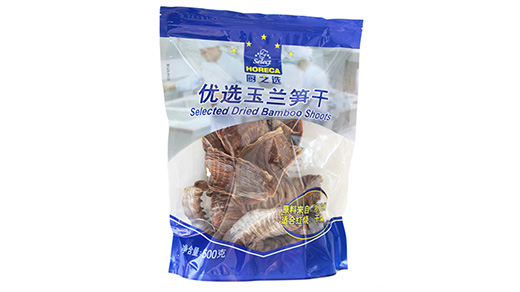 玉蘭筍干是用鮮嫩的春筍或冬筍經(jīng)加工而成的干制品,由于形狀和色澤很像玉蘭花的花瓣,故稱“玉蘭片”,經(jīng)采摘后,進行蒸、陰干、剝?nèi)ネ鈿ぁ⒃俜湃牒Y內(nèi)進行烘焙。工序皆為粗加工,以得到玉蘭片的好品質(zhì),不含任何添加劑防腐劑。